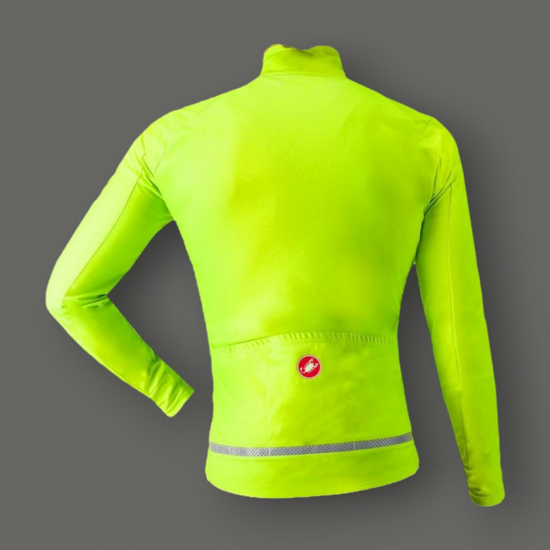 La Castelli Go Jacket pour homme, en Electric Lime/Black, est une veste de mi-saison polyvalente, idéale pour les sorties par temps frais ou légèrement humide. Conçue avec le tissu GORE-TEX INFINIUM™, elle offre une excellente protection contre le vent et les éclaboussures, tout en restant hautement respirante et confortable. Son design moderne et sa coupe ajustée garantissent performance et style sur le vélo.