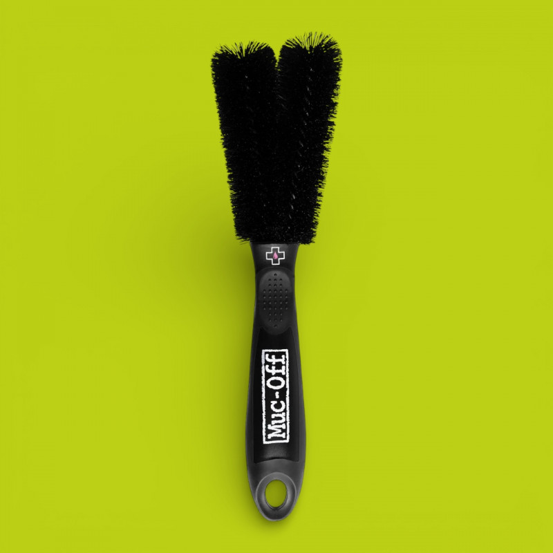 La brosse Two Prong Brush de Muc-Off est un outil de nettoyage spécialisé conçu pour atteindre les zones difficiles d’accès du vélo, là où le nettoyage classique avec une éponge ou une brosse standard est insuffisant. Grâce à une conception à double tête et des poils en nylon robustes, elle permet de déloger la saleté incrustée sur les rayons, disques de frein, manivelles, pédales et zones étroites, tout en offrant une adhérence optimale grâce à sa poignée ergonomique caoutchoutée qui limite les glissements même en conditions humides