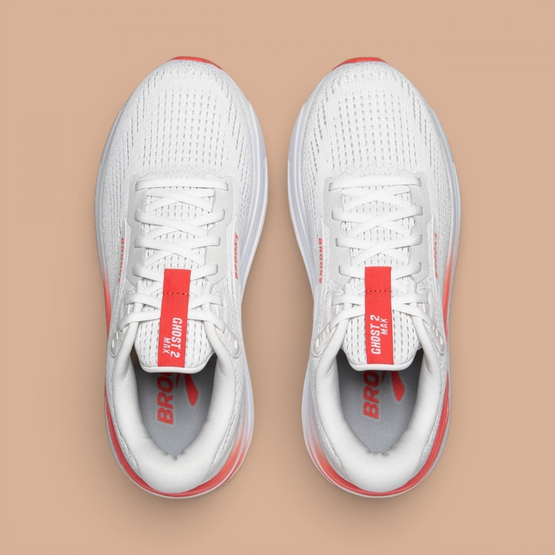La BROOKS Ghost Max 2 – White / Hot Coral est une chaussure de running à amorti maximal, conçue pour offrir un confort exceptionnel, une stabilité rassurante et une foulée fluide lors des entraînements quotidiens et des longues distances sur route.